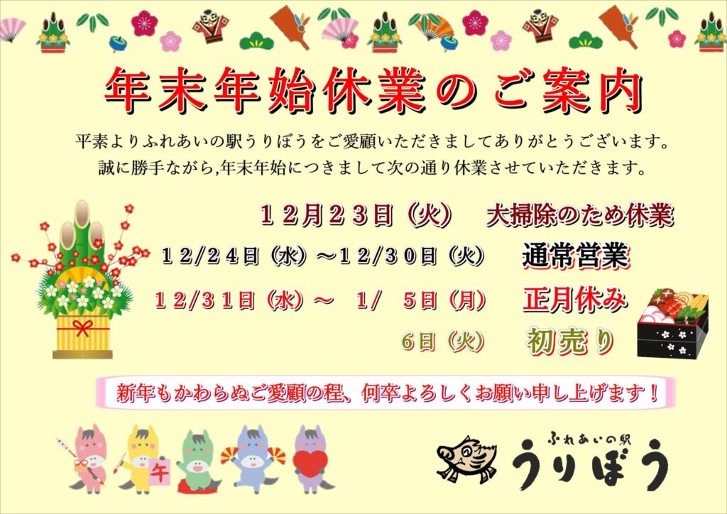 いつも「ふれあいの駅 うりぼう」をご利用いただき、ありがとうございます。本年もたくさんのご縁に恵まれ、心より感謝申し上げます。誠に勝手ながら、年末年始は下記の通り休業・営業日を変更させていただきます。ご来店予定のお客さまはご確認ください。2026年も、地域の農産物と笑顔を大切に、皆さまに喜んでいただける直売所を目指してまいります。