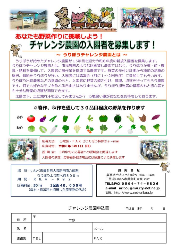 15年目を迎えたうりぼうチャレンジ農園の8年度入園者を募集します。